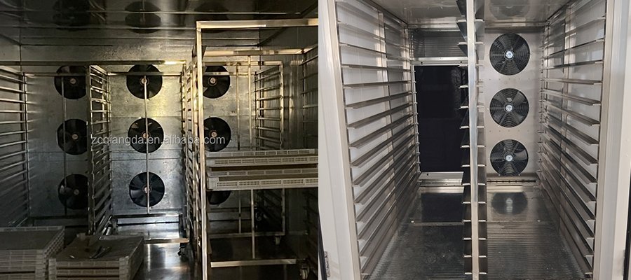 •امتصاص الرطوبة والتبخر: يتم توزيع الهواء الساخن والجاف بواسطة مراوح قوية فوق المنتج، مما يتسبب في تبخر الرطوبة السطحية.
