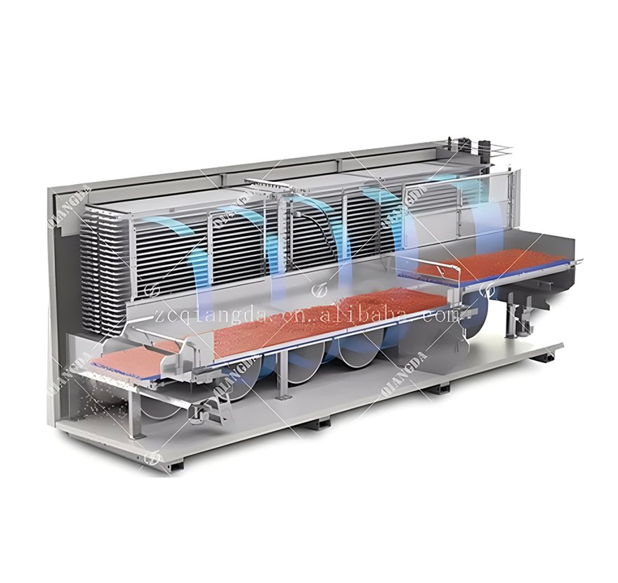 يتم نفخ تدفق الهواء عالي السرعة وذو درجة الحرارة المنخفضة للغاية (عادةً ما تكون 3-12 مترًا في الثانية أو أعلى) بالتساوي نحو أو عبر الطعام الذي يتم تغذيته باستمرار على حزام ناقل.